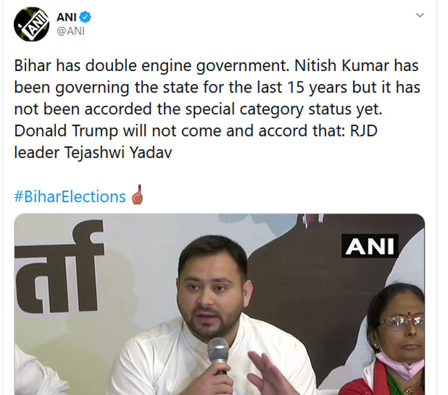 Bihar Election 2020: महागठबंधन के घोषणा पत्र में वायदों की झड़ी, तेजस्वी का तंज- क्या ट्रंप दिलाएंगे विशेष राज्य का दर्जा?