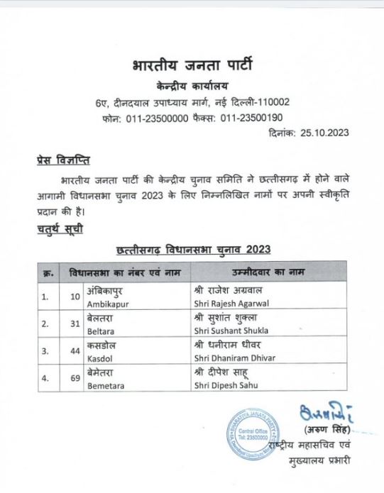 CG Election 2023 छत्तीसगढ़ में भाजपा ने चार बची हुई सीटों पर उम्मीदवारों का किया एलान कर दिया है। छत्तीसगढ़ की 90 सदस्यीय विधानसभा के लिए सात और 17 नवंबर को दो चरणों में मतदान होना है। पहले चरण के लिए नामांकन दाखिल करने का शुक्रवार को आखिरी दिन है। पहले चरण में 20 सीटों पर मतदान होगा। शेष 70 सीटों पर 17 नवंबर को मतदान होगा।