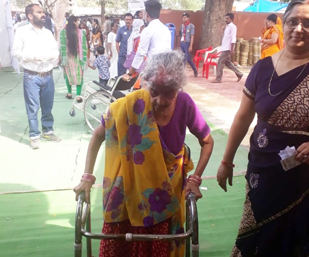 बिलासपुर में 75 वर्षीय हरियाली बाई वॉकर से पहुंची मतदान केन्द्र।