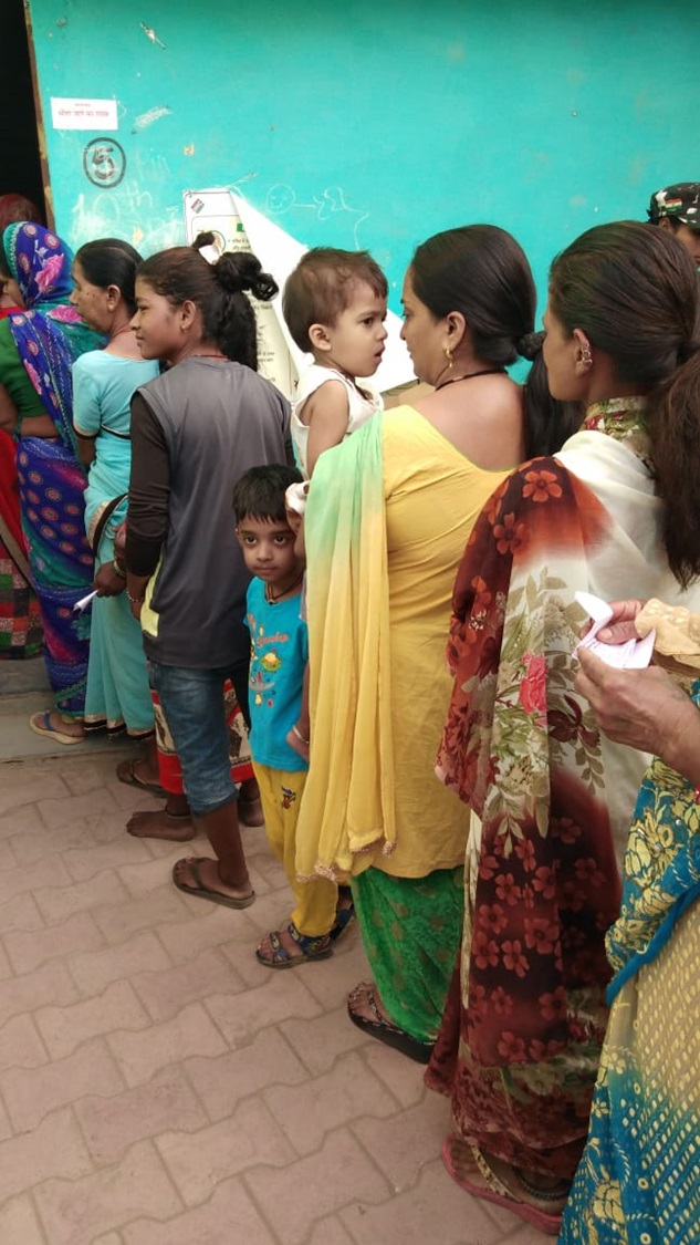 रायपुर दक्षिण सीट पर महिलाएं अपने बच्चों के साथ मतदान करने के लिए लाइन में लगी है।