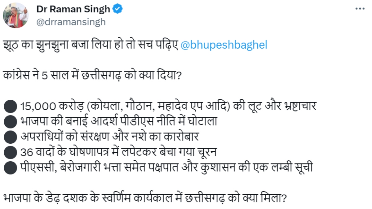 पूर्व सीएम रमन सिंह ने लिखा, "पांच साल में 15,000 करोड़ (कोयला, गोठान, महादेव एप आदि) की लूट, बीजेपी की बनाई आदर्श पीडीएस नीति में घोटाला, अपराधियों को संरक्षण और नशे का कारोबार, 36 वादों के घोषणापत्र में लपेटकर बेचा गया चूरन,पीएससी, बेरोजगारी भत्ता समेत पक्षपात और कुशासन की एक लम्बी सूची है।"