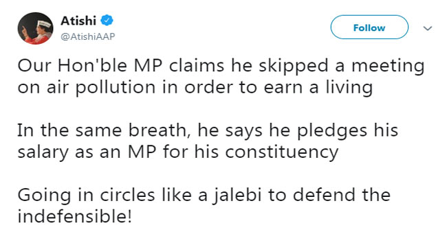 आतिशी ने एक अन्य ट्वीट में लिखा ,' गौतम गंभीर अपने गलत कार्यों का भी बचाव कर रहे हैं। आतिश ने गंभीर पर निशाना साधते हुए कहा कि वे कहते हैं कि सांसद के तौर पर अपना वेतन लोगों की सेवा के लिए दान कर रहे हैं लेकिन प्रदूषण जैसे अहम मुद्दे को दरकिनार कर जलेबी खाने में व्यस्त हैं'।
