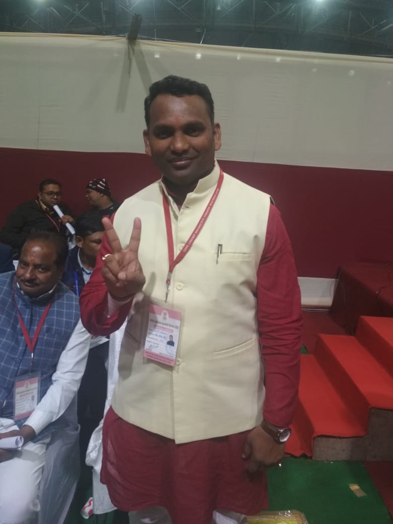 -त्रिलोकपुरी विधानसभा से चौथे राउंड में 12579 वोटों की बढ़त के बाद विजय चिन्ह दिखाते हुए आप प्रत्याशी रोहित महरौलिया।