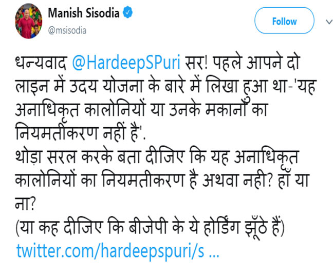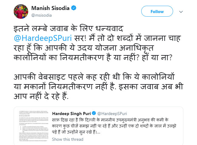 इसके बाद मनीष सिसोदिया ने एक फिर ट्वीट करके हरदीप सिंह पुरी से कहा कि पहले आपने दो लाइन में उदय योजना के बारे में लिखा हुआ था-'यह अनाधिकृत कॉलोनियों या उनके मकानों का नियमतीकरण नहीं है'। थोड़ा सरल करके बता दीजिए कि यह अनाधिकृत कॉलोनियों का नियमतीकरण है अथवा नही? हां या ना?।