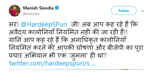 दरअसल मनीष सिसोदिया ट्विटर पर हरदीप सिंह पुरी से पूछा कि अब आप कह रहे हैं कि अवैध कॉलोनिया नियमित नही की जा रही हैं!! यानि आप कह रहे हैं कि अनाधिकृत कालोनियां नियमित करने की आपकी घोषणा और बीजेपी का पूरा प्रचार अभियान भी एक 'जुमला' ही था?