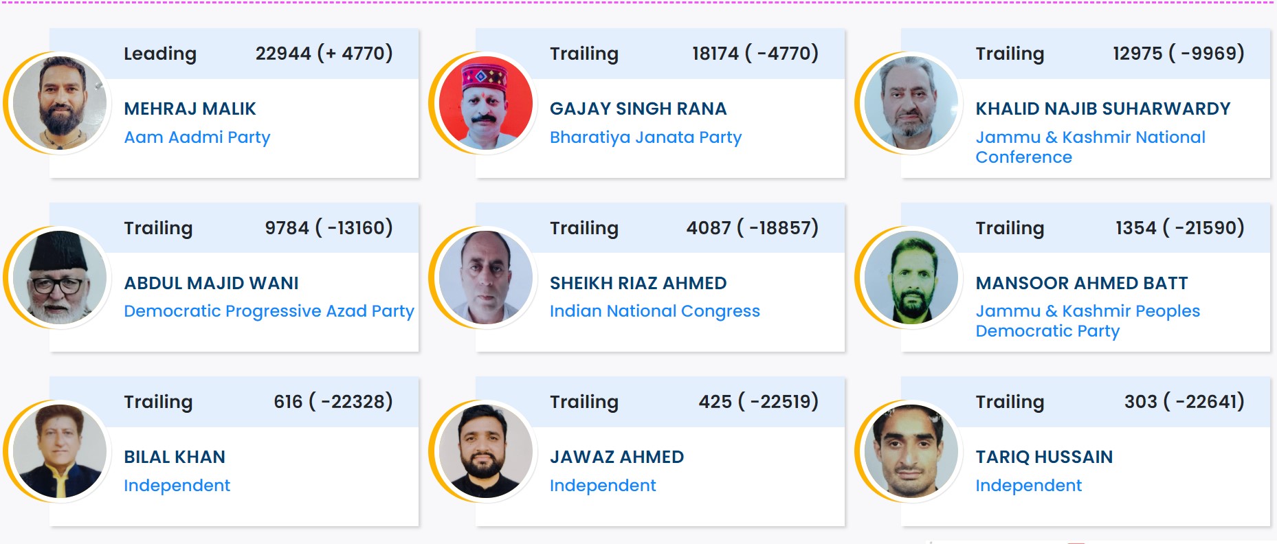 चुनाव आयोग की वेबसाइट के मुताबिक, जम्मू-कश्मीर की डोडा विधानसभा सीट से आम आदमी पार्टी (आप) के प्रत्याशी मेहराज मलिक ने भाजपा नेता गजय सिंह राणा को 4770 से ज्यादा वोटों से हराया है।