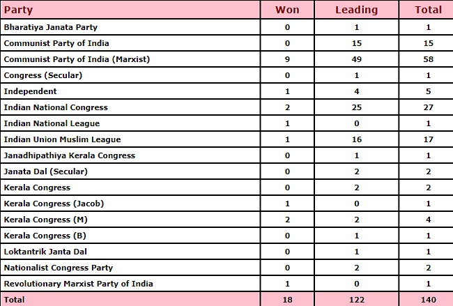 - केरल में 1 सीट पर CPI (M) व 1 पर इंडियन नेशनल लीग को जीत हासिल हुई है।