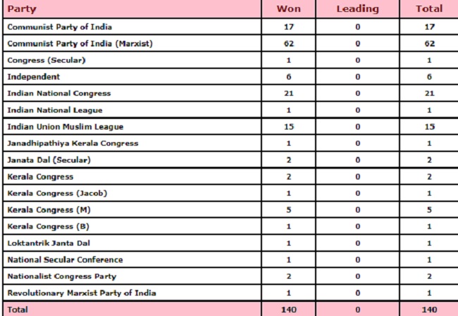 केरल में मतगणना के बाद आए नतीजे के अनुसार लगातार दूसरी बार LDF राज्य की सत्ता में आई है, इसे 99 सीटों पर जीत हासिल हुई और UDF को 41 सीटों पर वहीं NDA के खाते में एक भी सीट नहीं। यहां का रिकॉर्ड है कि एक बार सत्ता में LDF आती है तो दूसरी बार UDF को जीत हासिल होती है लेकिन इस बार यह परंपरा टूट गई।