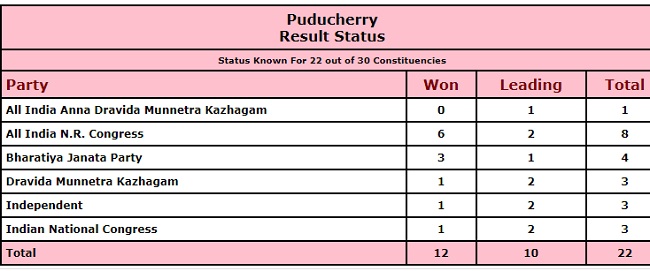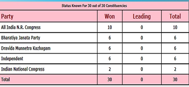 पुडुचेरी में 30 सीटों का ये रहा परिणाम-