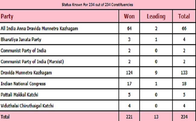 राज्य के 234 विधानसभा सीटों में से अकेले DMK को 43 सीटों पर जीत मिली वहीं 90 सीटों पर निर्णायक बढ़त हासिल हुई है। इसके अलावा उसके सहयोगी दलों ने भी अपनी-अपनी सीटों पर अच्छा प्रदर्शन किया है। जिससे DMK को पूर्ण बहुमत से सरकार बनाता दिख रहा है।