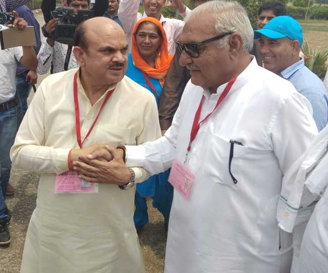 सोनीपत से कांग्रेस प्रत्याशी भूपेंद्र सिंह हुड्डा और भाजपा प्रत्याशी रमेश कौशिक एक-दूसरे से मुलाकात करते हुए।
