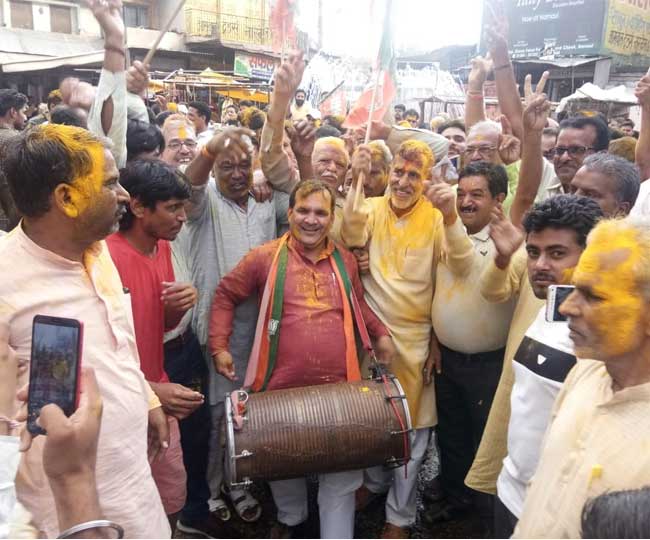 नारनौल के आजाद चौक में जीत के जश्न में सराबोर हुए भाजपा कार्यकर्ता।
