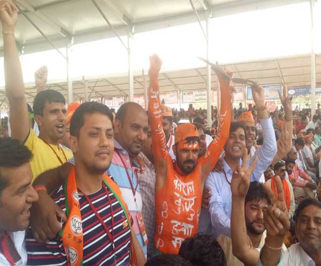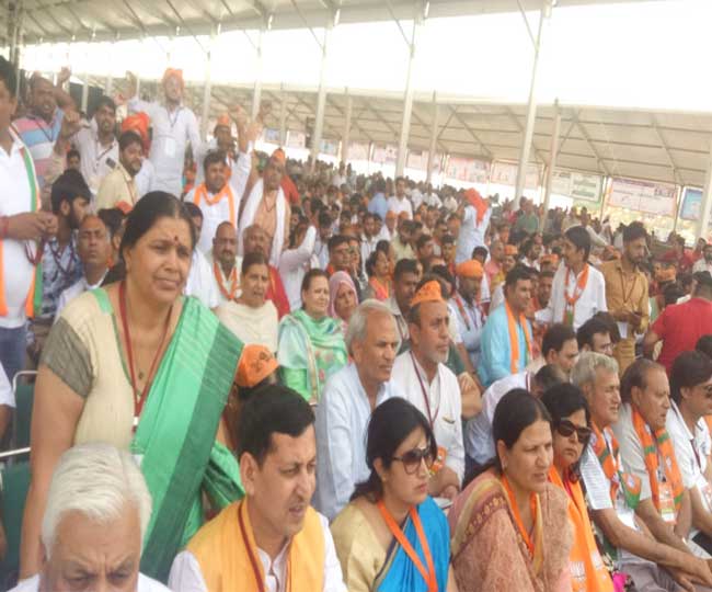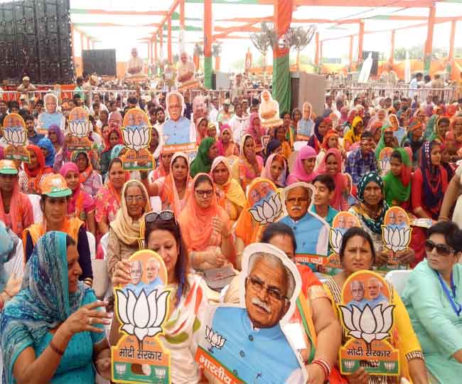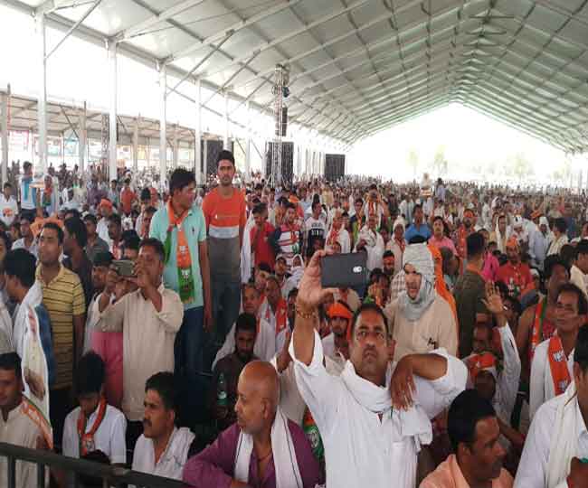 रोहतक में प्रधानमंत्री की रैली में पहुंचे लोग।
