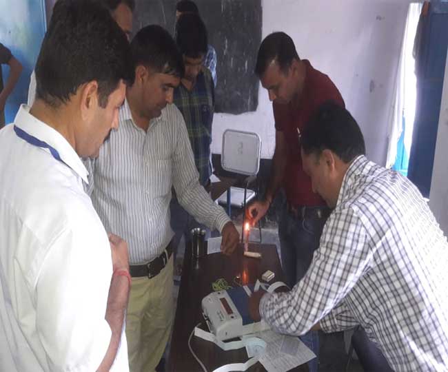 फतेहाबाद में बूथ नंबर 24 पर ईवीएम को ठीक करने में जुटे कर्मी।