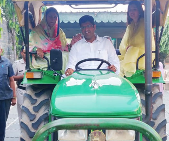 जेजेपी प्रमुख दुष्यंत चौटाला अपनी मां नैना चौटाला के साथ ट्रैक्टर से सिरसा स्थित मतदान केंद्र पहुंचे।