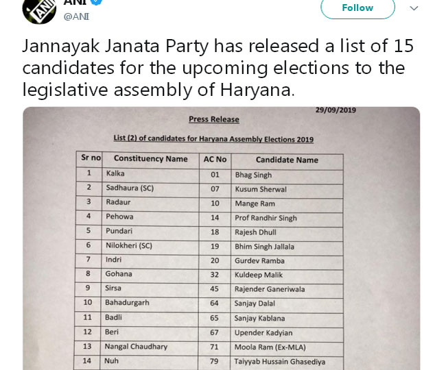 Haryana assembly Election: जजपा ने नूहं और फरीदाबाद से तय किए प्रत्याशी, यहां देखें नाम