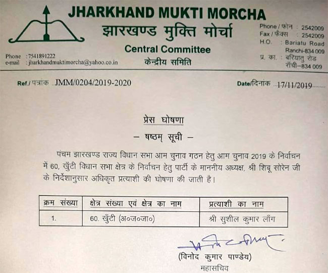 झारखंड मुक्ति मोर्चा ने उम्मीदवारों की छठी सूची रविवार को जारी कर दी। इसमें खूंटी के उम्मीदवार का एलान किया गया है। झामुमो के टिकट पर खूंटी से सुशील कुमार लौंग चुनाव लड़ेंगे। यह सीट अनुसूचित जनजाति के लिए आरक्षित है।