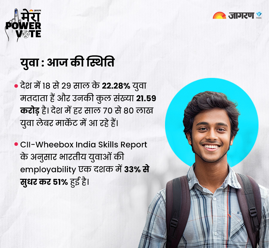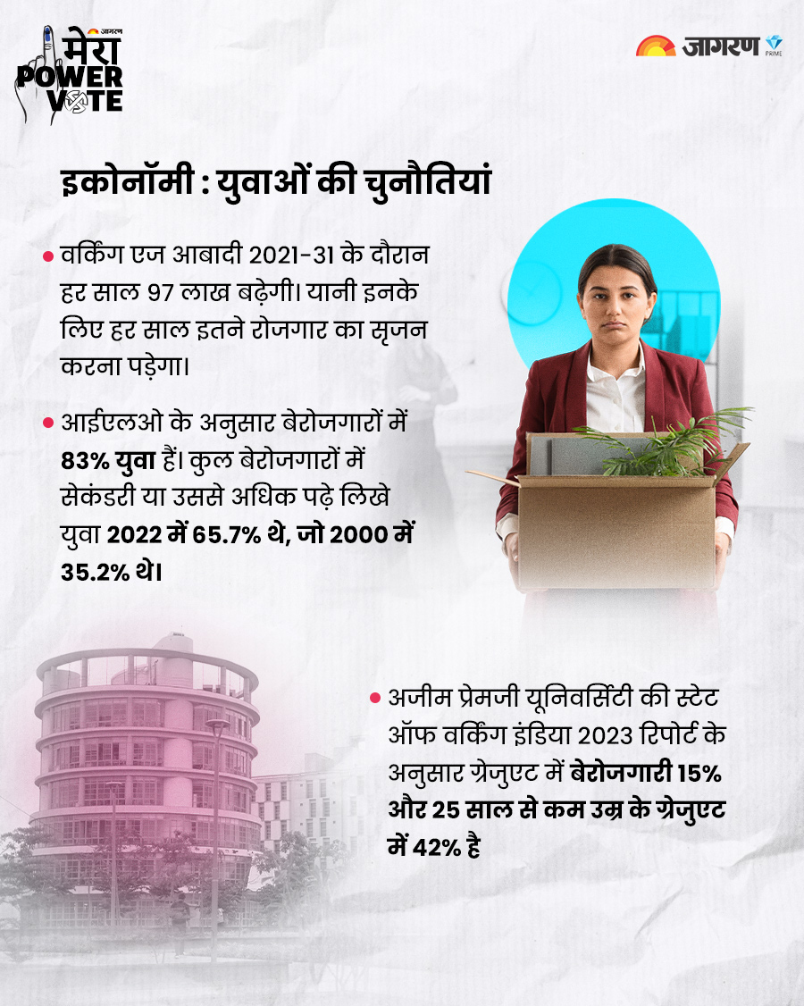 एस.के. सिंह, नई दिल्ली। लोकसभा चुनाव को देखते हुए जागरण न्यू मीडिया मतदाताओं को जागरूक करने के मकसद से ‘मेरा पावर वोट- नॉलेज सीरीज’ लेकर आया है। इसमें हमारे जीवन से जुड़े पांच बुनियादी विषयों इकोनॉमी, सेहत, शिक्षा, इन्फ्रास्ट्रक्चर और सुरक्षा पर चर्चा की जा रही है। हमने हर सेगमेंट को चार हिस्से में बांटा है- महिला, युवा, शहरी मध्य वर्ग और किसान। इसका मकसद आपको एंपावर करना है ताकि आप मतदान करने में सही फैसला ले सकें। इस नॉलेज सीरीज में बात इकोनॉमी और युवाओं की।