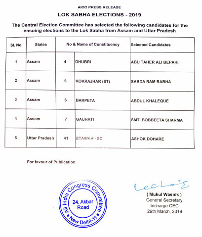 नई दिल्ली, एएनआइ। लोकसभा चुनाव (Lok Sabha Election 2019) के लिए कांग्रेस ने एक और लिस्ट जारी कर दी है। कांग्रेस पार्टी ने शुक्रवार का एक के बाद एक दो लिस्ट जारी कर दी हैं। दूसरी लिस्ट में पांच उम्मीदवारों की घोषणा की गई है। इसमें एक उम्मीदवार अशोक दोहरे उत्तर प्रदेश के इटावा से ऐसे भी हैं, जिन्होंने आज ही भाजपा को छोड़ कांग्रेस ज्वाइन की है। इसके अलावा असम की चार सीटों पर कांग्रेस ने अपने उम्मीदवार घोषित किए हैं।
