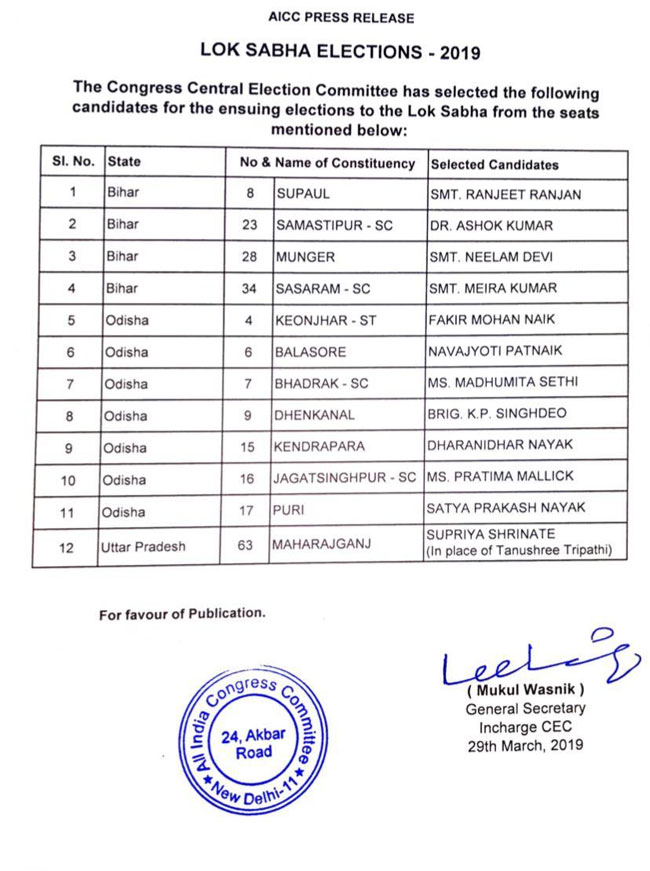 इससे पहले कांग्रेस ने आज जो लिस्ट जारी की, उसमें 7 उम्मीदवार ओडिशा, 4 बिहार और एक उम्मीदवार उत्तर प्रदेश से है। इस लिस्ट में लोकसभा की पूर्व स्पीकर का भी नाम है, जिन्हें बिहार के सासाराम से उम्मीवार चुना गया है।