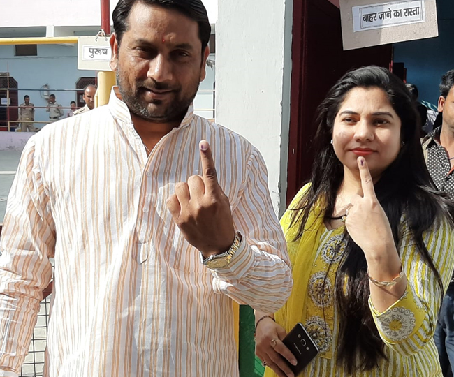 मेरठ के शास्त्री नगर संत विवेकानंद स्कूल मैं लोकसभा चुनाव के लिए मतदान कर कराते भाजपा विधायक दक्षिण डॉ सोमेंद्र तोमर अपनी पत्नी के साथ बूथ नंबर 310।