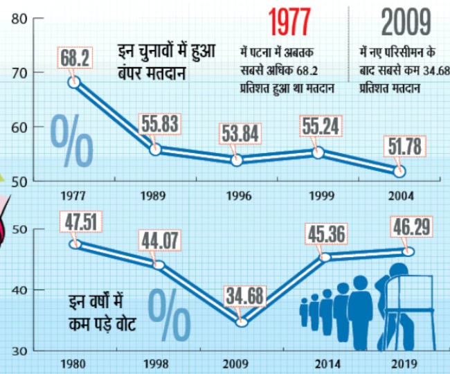 1977 में सबसे अधिक 68.2 प्रतिशत मतदाता बूथों पर पहुंचे। वर्ष 1984 में पूर्व प्रधानमंत्री इंदिरा गांधी की हत्या के बाद आम चुनाव में भी यहां पर वोट का प्रतिशत 52.4 प्रतिशत पर रुक गया। पिछले ढाई दशक के आकड़ों पर गौर करें तो चार लोकसभा चुनावों में 51 से लेकर 56 प्रतिशत के बीच मतदान हुआ।