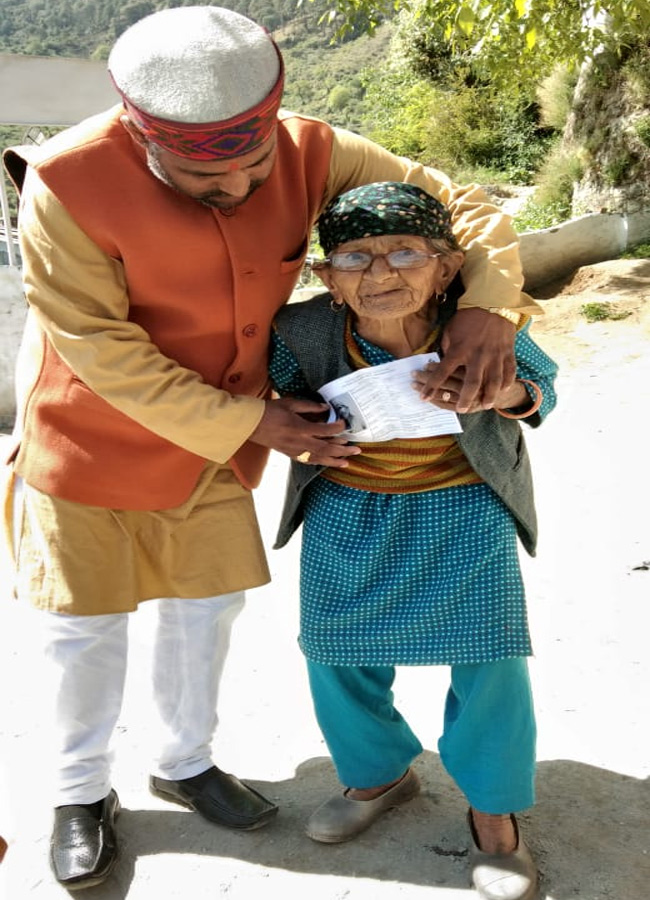 * उत्तराखंड के केली गांव में 95 साल की वृद्ध महिला को वोट डलवाने ले जाते युवक।