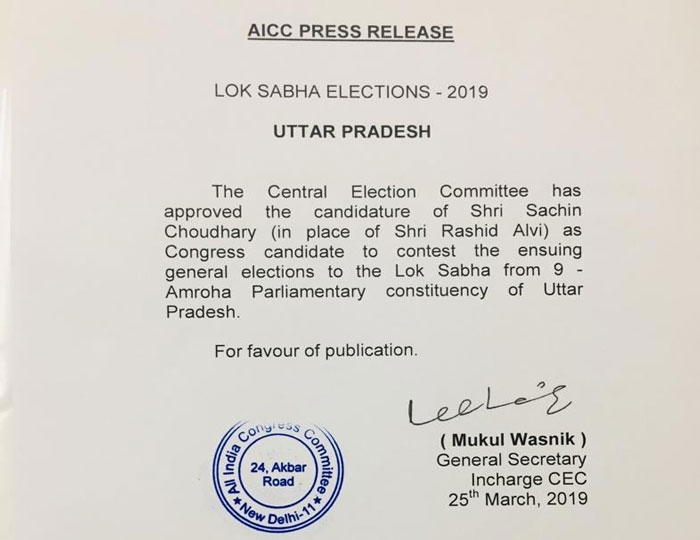 Loksabha Election 2019 :कांग्रेस ने 36 घंटे में बदला अमरोहा का प्रत्याशी, राशिद अल्वी की जगह सचिन चौधरी