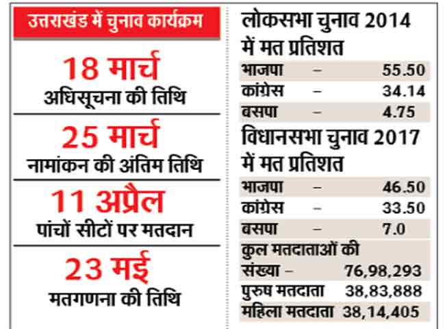 देहरादून, विकास धूलिया। निर्वाचन आयोग के कार्यक्रम घोषित करते ही आम चुनाव की रणभेरी बज गई। उत्तराखंड में पांचों सीटों पर पहले ही चरण में 11 अप्रैल को मतदान होगा। यानी, उत्तराखंड में व्यापक जनाधार और मजबूत नेटवर्क वाली दोनों राष्ट्रीय पार्टियों, भाजपा और कांग्रेस पर अब यह अहम जिम्मेदारी आ गई है कि वह महासमर की शुरुआत पूरे देश में अपने पक्ष में संदेश देकर करें।