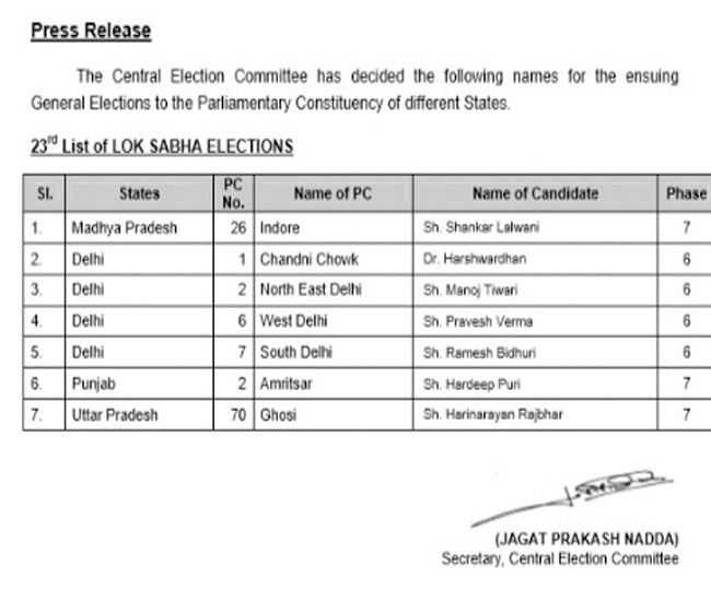 वहीं, दिल्ली में 12 मई को होने वाले मतदान के मद्देनजर ने भाजपा ने दिल्ली की चार लोकसभा सीटों पर अपने प्रत्याशियों के नामों का ऐलान कर दिया है। भाजपा की ताजा सूची के तहत उत्तर पूर्वी दिल्ली से मनोज तिवारी, दक्षिणी दिल्ली से रमेश बिधूड़ी, पश्चिमी दिल्ली से प्रवेश वर्मा और चांदनी चौक सीट पर हर्षवर्धन को उम्मीदवार बनाया है। इन चारों सीटों पर भाजपा ने अपने मौजूदा सांसदों पर भरोसा जताया है।