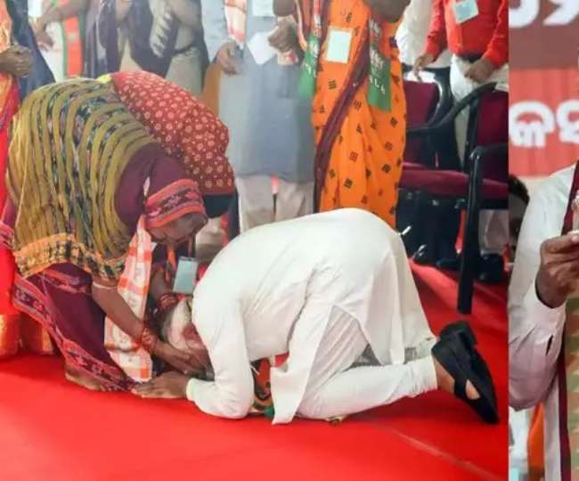 यह तस्वीर ओडिशा की है। यहां पीएम मोदी ने महिला समर्थकों के पैर छूकर उनसे आशीर्वाद लिया।