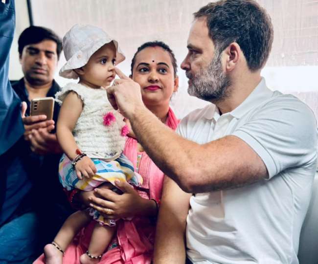नन्ही बच्ची को कुछ इस तरह दुलार करते नजर आए राहुल गांधी।