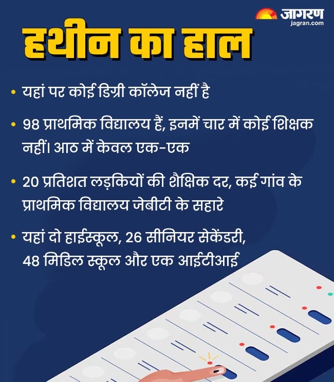 देश की राजधानी से महज 65 किमी दूर पलवल के हथीन क्षेत्र तक विकास की किरण नहीं पहुंची है। शिक्षा, स्वास्थ्य, रोजगार व विकास के मामले में यह क्षेत्र बेहद पिछड़ा हुआ है। यहां 95 प्रतिशत इलाका ग्रामीण है। पांच प्रतिशत कस्बाई है। 84 गांव हैं। अधिकतर गांव मुस्लिम बहुल हैं। हिंदुओं के बाद यहां सबसे बड़ी आबादी मुस्लिमों की है।