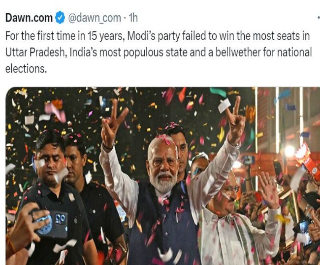 पाकिस्तानी अखबार डॉन ने लिखा कि मोदी की हिंदू-राष्ट्रवादी भारतीय जनता पार्टी (BJP) के नेतृत्व वाले गठबंधन ने देश के लोकसभा चुनाव में बहुमत हासिल किया है। मगर उम्मीद के मुताबिक भारी बहुमत से यह आंकड़ा काफी कम रहा। यह लोकप्रिय नेता के लिए एक आश्चर्यजनक झटका था।