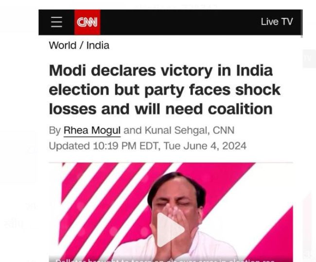 सीएनएन लिखता है कि भारत के प्रधानमंत्री नरेंद्र मोदी ने मंगलवार शाम को राष्ट्रीय चुनाव में जीत की घोषणा की। मगर उनका अजेय बहुमत हासिल करने का लक्ष्य धराशायी हो गया। सत्ता में उनकी पार्टी की पकड़ कमजोर हुई है। मोदी अपने एनडीए सहयोगियों की मदद से सरकार बनाने को तैयार हैं। सीएनएन ने लिखा कि लगातार तीसरा कार्यकाल एक ऐसा मील का पत्थर है, जो उन्हें स्वतंत्रता के बाद भारत में सबसे सफल राजनेताओं में से एक बनाता है।