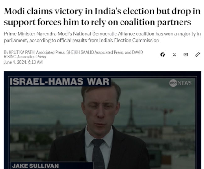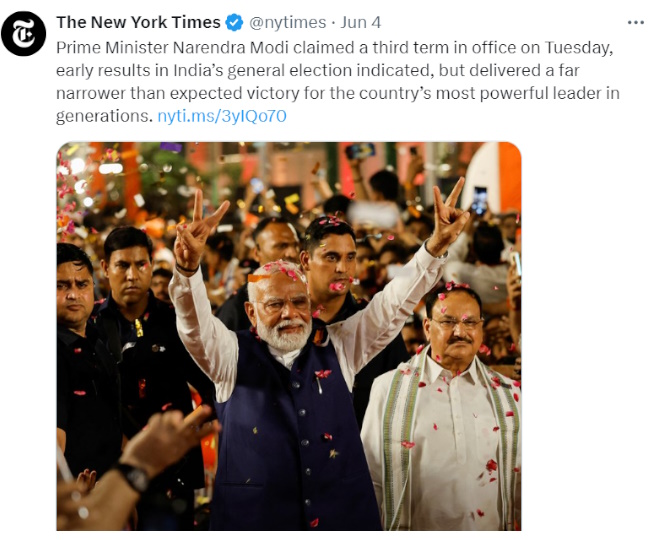 अमेरिकी अखबार न्यूयॉर्क टाइम्स लिखता है कि प्रधानमंत्री नरेंद्र मोदी ने मंगलवार को तीसरी बार प्रधानमंत्री पद पर जीत मिली, लेकिन देश के सबसे शक्तिशाली नेता को उम्मीद से कहीं कम अंतर से जीत मिली है। एबीसी न्यूज ने लिखा कि नरेन्द्र मोदी ने भारत के लोकसभा चुनाव में अपने गठबंधन की जीत की घोषणा की। उन्होंने अपने एजेंडे पर आगे बढ़ने के लिए जनादेश का दावा किया। मगर उनकी पार्टी को अपेक्षा से अधिक मजबूत विपक्ष के हाथों सीटें गंवानी पड़ीं।