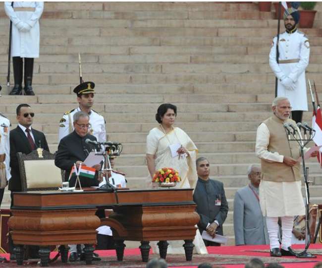 26 मई 2014 को उन्होंने पांचवीं बार शपथ ली। इस बार उन्होंने पहली बार प्रधानमंत्री पद की शपथ ली। 64 साल की आयु में नरेंद्र मोदी पहली बार प्रधानमंत्री बने थे। चुनाव परिणाम के 10 दिनों बाद शपथ ग्रहण की थी।