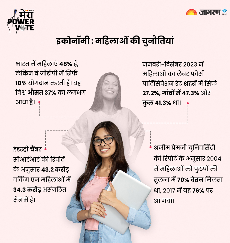 एस.के. सिंह, नई दिल्ली। अठारहवीं लोकसभा के लिए पहले चरण का मतदान हो चुका है। जागरण न्यू मीडिया मतदाताओं को जागरूक करने के लिए ‘मेरा पावर वोट- नॉलेज सीरीज’ लेकर आया है। इसमें हमारे जीवन से जुड़े पांच बुनियादी विषयों इकोनॉमी, सेहत, शिक्षा, इन्फ्रास्ट्रक्चर और सुरक्षा पर चर्चा की जाएगी। हमने हर सेगमेंट को चार हिस्से में बांटा है- महिला, युवा, शहरी मध्य वर्ग और किसान। इसका मकसद आपको एंपावर करना है ताकि आप मतदान करने में सही फैसला ले सकें। नॉलेज सीरीज में सबसे पहले बात इकोनॉमी और महिलाओं की।