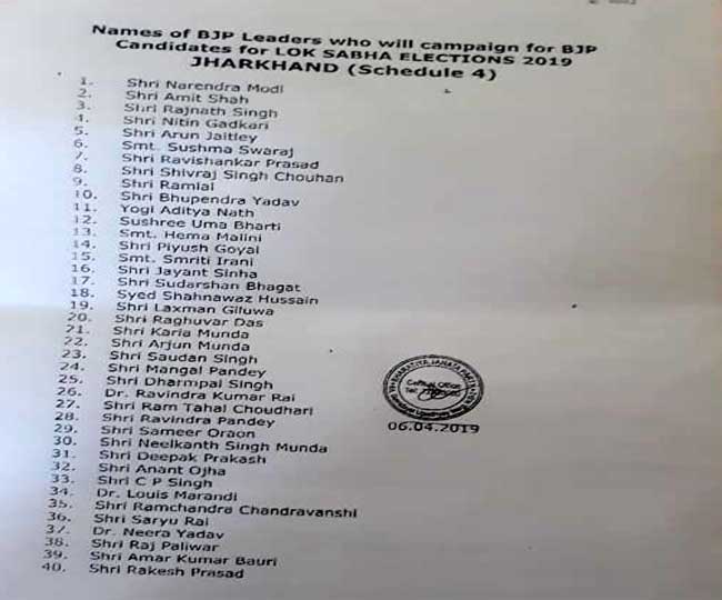 Lok Sabha Election 2019. भारतीय जनता पार्टी ने झारखंड के लिए अपने 40 स्टार प्रचारकों की सूची जारी कर दी है।