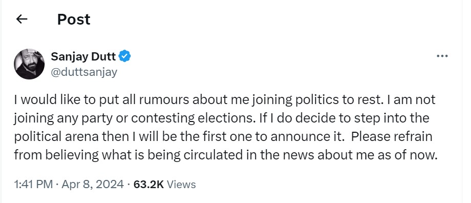 संजय दत्त ने अपने आधिकारिक एक्स (ट्विटर) अकाउंट पर पोस्ट कर लिखा, ''मैं अपने राजनीति में शामिल होने की सभी अफवाहों पर विराम लगाना चाहता हूं। मैं न तो किसी पार्टी में शामिल हो रहा हूं और न ही चुनाव लड़ रहा हूं। अगर मैं राजनीति में आता हूं तो मैं खुद आगे आकर इसकी घोषणा करूंगा। अभी मेरे चुनाव लड़ने को लेकर जो खबरें चल रही हैं, उन पर भरोसा न करें।''