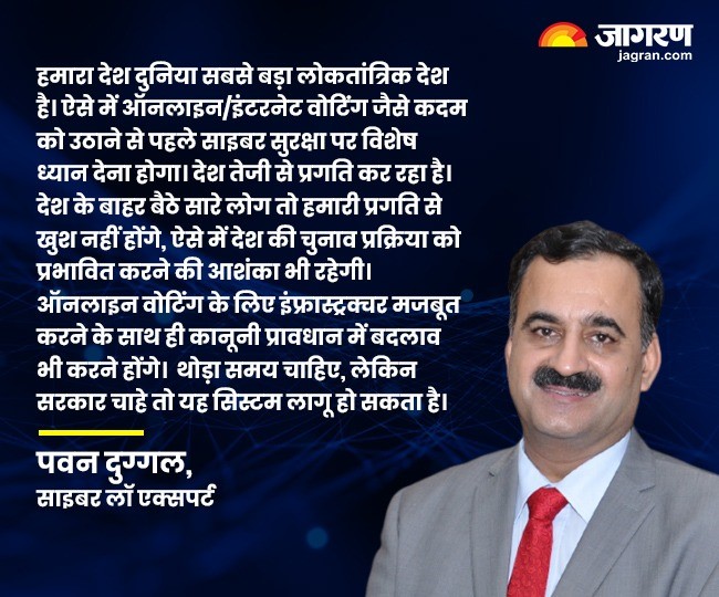 इंटरनेट के जरिये वोटिंग को लेकर साइबर लॉ एक्सपर्ट पवन दुग्गल का कहना है कि हमारा देश दुनिया सबसे बड़ा लोकतांत्रिक देश है। ऐसे में ऑनलाइन/इंटरनेट वोटिंग जैसे कदम को उठाने से पहले साइबर सुरक्षा पर विशेष ध्यान देना होगा। भारत तेजी से प्रगति कर रहा है। देश के बाहर बैठे सारे लोग तो हमारे देश की प्रगति से खुश नहीं होंगे, ऐसे में देश की चुनाव प्रक्रिया को प्रभावित करने की आशंका भी रहेगी। ऑनलाइन वोटिंग के लिए इंफ्रास्ट्रक्चर मजबूत करने के साथ ही कानूनी प्रावधान में बदलाव भी करने होंगे।