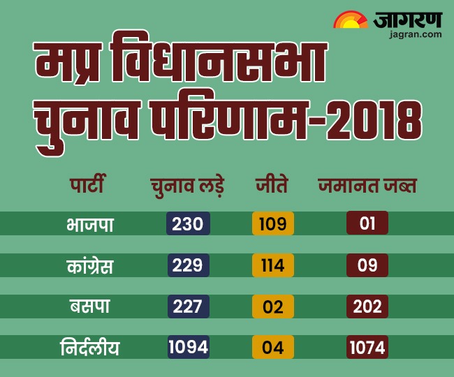 साल 2018 के मध्य प्रदेश विधानसभा चुनाव में कांग्रेस को स्पष्ट बहुमत तो नहीं मिला, लेकिन उसे भाजपा को पीछे छोड़ने के साथ ही बहुमत के करीब पहुंचने में सफलता जरूर मिली थी। कांग्रेस को बहुमत से दो सीटें कम यानी 114 सीटें मिली थीं, जबकि भाजपा 109 सीटें ही जीत पाई थी। मजेदार बात यह है कि चुनाव बेशक भाजपा हारी, लेकिन भाजपा के एक ही नेता की जमानत जब्त हुई थी, जबकि कांग्रेस के नौ नेता अपनी जमानत नहीं बचा पाए।