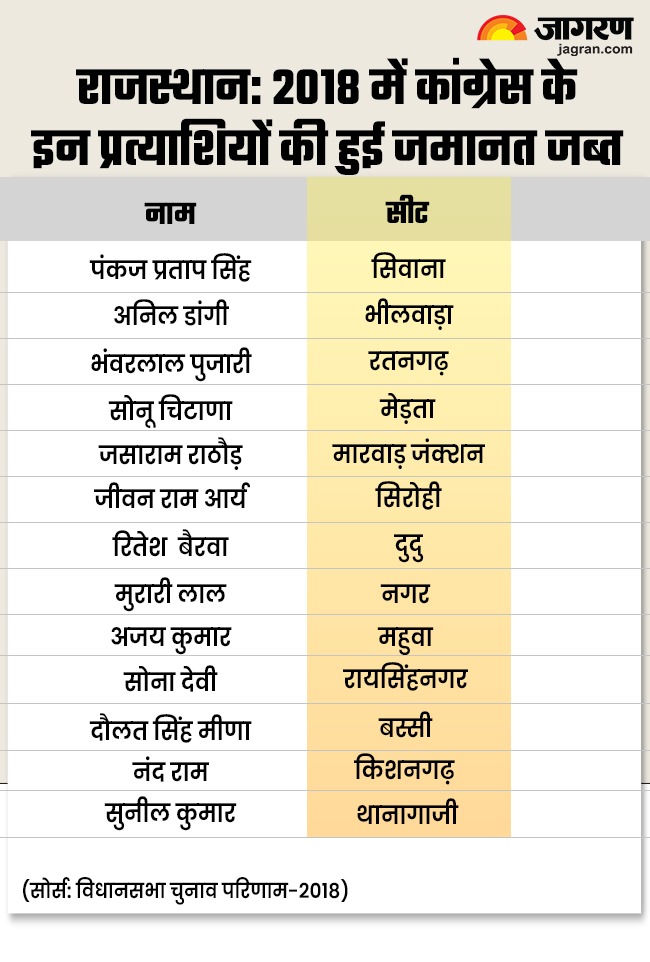 अगर राजस्थान की बात करें तो राजस्थान विधानसभा चुनाव परिणाम में जिन 15 उम्मीदवारों की जमानत जब्त हो गई, उनमें से तीन भारतीय जनता पार्टी के थे, जबकि 12 कांग्रेस के थे। जिन 15 उम्मीदवारों की जमानत जब्त हुई, उनमें से तीन पूर्व मंत्री- घनश्याम तिवाड़ी, सुरेंद्र गोयल और रोहिताश कुमार शामिल थे।