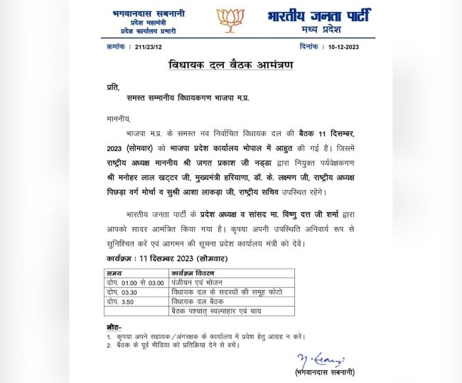डिजिटल डेस्क, भोपाल। मध्य प्रदेश के पड़ोसी राज्य छत्तीसगढ़ में मुख्यमंत्री के चेहरे को लेकर बना हुआ सस्पेंस समाप्त हो गया, लेकिन अभी भी मध्य प्रदेश में तरह-तरह के कयास लगाए जा रहे हैं। इस बीच, विधायक दल की बैठक को लेकर बड़ा अपडेट सामने आया है। बता दें कि भाजपा विधायक दल की बैठक 11 दिसंबर दिन सोमवार को भोपाल में होगी।
