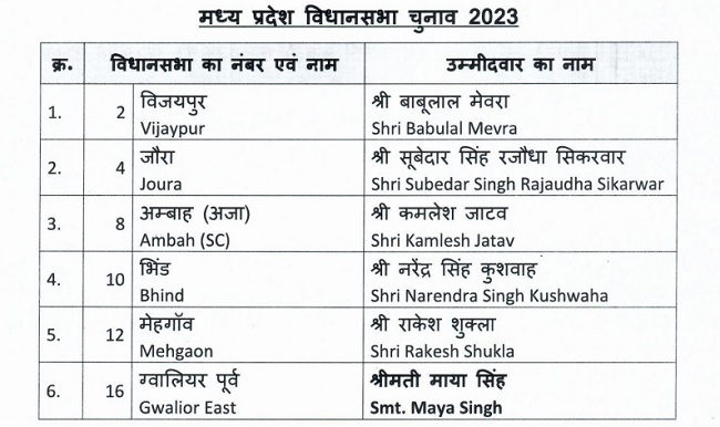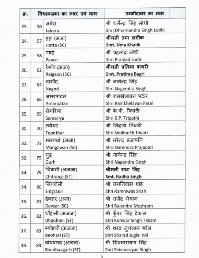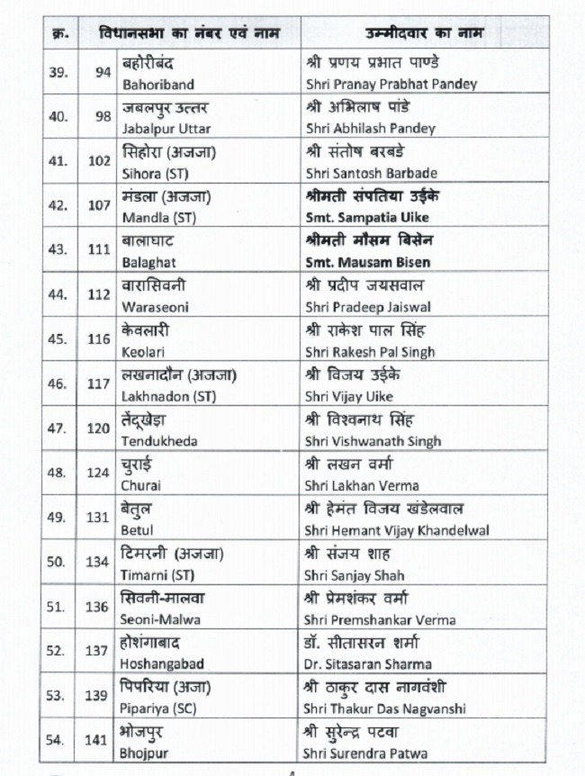 भाजपा ने पांचवीं सूची में 12 महिला उम्मीदवारों पर दांव लगाया। इनमें ग्वालियर पूर्व से माया सिंह, हट्टा से उमा खटीक, रैगांव से प्रतिमा बागरी, चित्रांगी से राधा सिंह, मंडला से संपतिया उईके, बालाघाट से मौसम विसेन, खंडवा से कंचन मुकेश तन्वे, पंधाना से छाया मोरे, नेपानगर से मंजू राजेंद्र दादू, बुरहानपुर से अर्चना चिटनिस, धार से नीना विक्रम वर्मा और डॉ अम्बेडकर नगर-महू से उषा ठाकुर शामिल हैं।