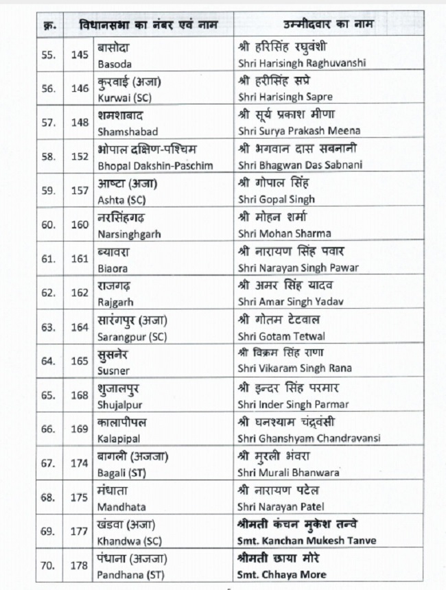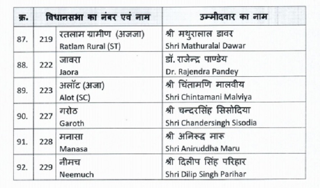मध्य प्रदेश विधानसभा चुनाव के लिए भारतीय जनता पार्टी ने शनिवार को 92 उम्मीदवारों की पांचवीं लिस्ट जारी की। बीती रात को दिल्ली में भाजपा मुख्यालय में केंद्रीय चुनाव समिति की बैठक में उम्मीदवारों के नाम पर मंथन हुआ था। इस मंथन के बाद पार्टी ने उम्मीदवारों की लिस्ट जारी कर दी।
