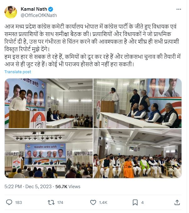 कमल नाथ प्रदेश कांग्रेस कमल नाथ ने कहा कि 1977 में हम इससे भी बुरी तरह हारे थे। तब इंदिरा गांधी और संजय गांधी भी हार गए थे। हम एकजुट हुए और तीन वर्ष बाद हुए आम चुनाव में 300 से अधिक सीटों के साथ इंदिरा गांधी ने पूर्ण बहुमत की सरकार बनाई थी। इसी तरह चार माह बाद होने वाले लोकसभा चुनाव की तैयारी में जुटना है। 10 दिनों में सभी अपनी रिपोर्ट भेजें।