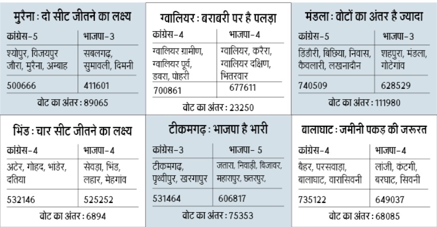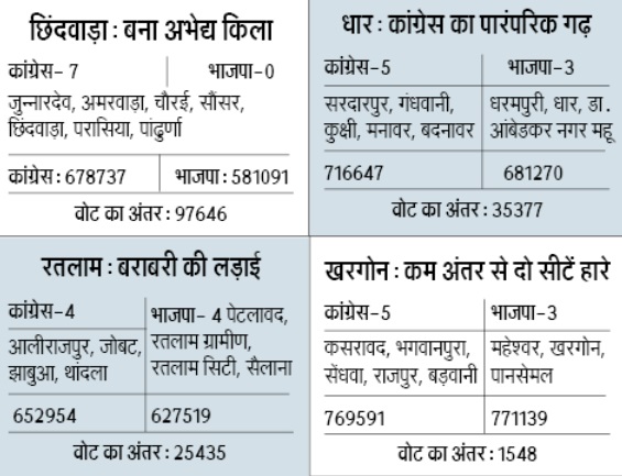 इसी तरह मुरैना की पांच, भिंड की चार, ग्वालियर की चार, टीकमगढ़ की तीन, मंडला की पांच, बालाघाट की चार, रतलाम की चार, धार की पांच और खरगोन लोकसभा क्षेत्र की आठ विधानसभा सीटों में से पांच पर भाजपा को हार का सामना करना पड़ा है। भाजपा अब इन विधानसभा सीटों को लेकर मंथन कर रही है और लोकसभा चुनाव की दृष्टि से इन सीटों पर मजबूत पकड़ बनाने में जुट गई है। इन हारी हुई सीटों पर भाजपा को लोकसभा चुनाव में दोगुनी मेहनत करनी होगी।
