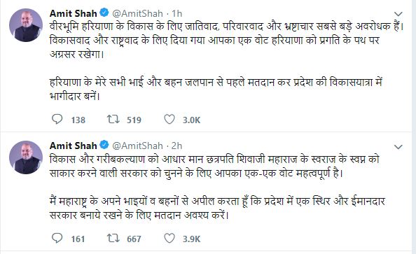 हरियाणा में चुनावों के लिए, शाह ने ट्वीट किया, 'जातिवाद, परिवारवाद और भ्रष्टाचार हरियाणा के विकास के लिए सबसे बड़े अवरोधक हैं। विकास और राष्ट्रवाद के लिए आपका एक वोट हरियाणा को प्रगति के पथ पर बनाए रखेगा। हरियाणा के सभी भाई-बहन जलपान से पहले वोट करें और राज्य की विकास प्रक्रिया में भाग लें।'