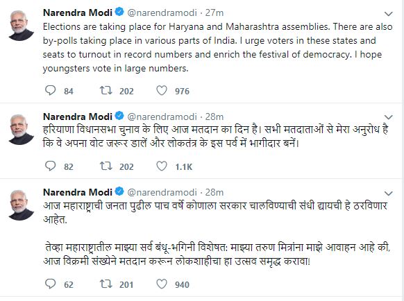 पीएम मोदी ने पहला ट्वीट मराठी में किया, जिसमें उन्होंने लिखा, 'आज महाराष्ट्र की जनता यह तय करने जा रही है कि अगले पांच साल तक राज्य में सरकार चलाने का मौका किसे देना है। इसलिए महाराष्ट्र के सभी भाइयों और बहनों खास युवा लोगों से मेरी अपील है कि आज रिकॉर्ड संख्या में मतदान करके लोकतंत्र के इस पर्व को समृद्ध करें!'